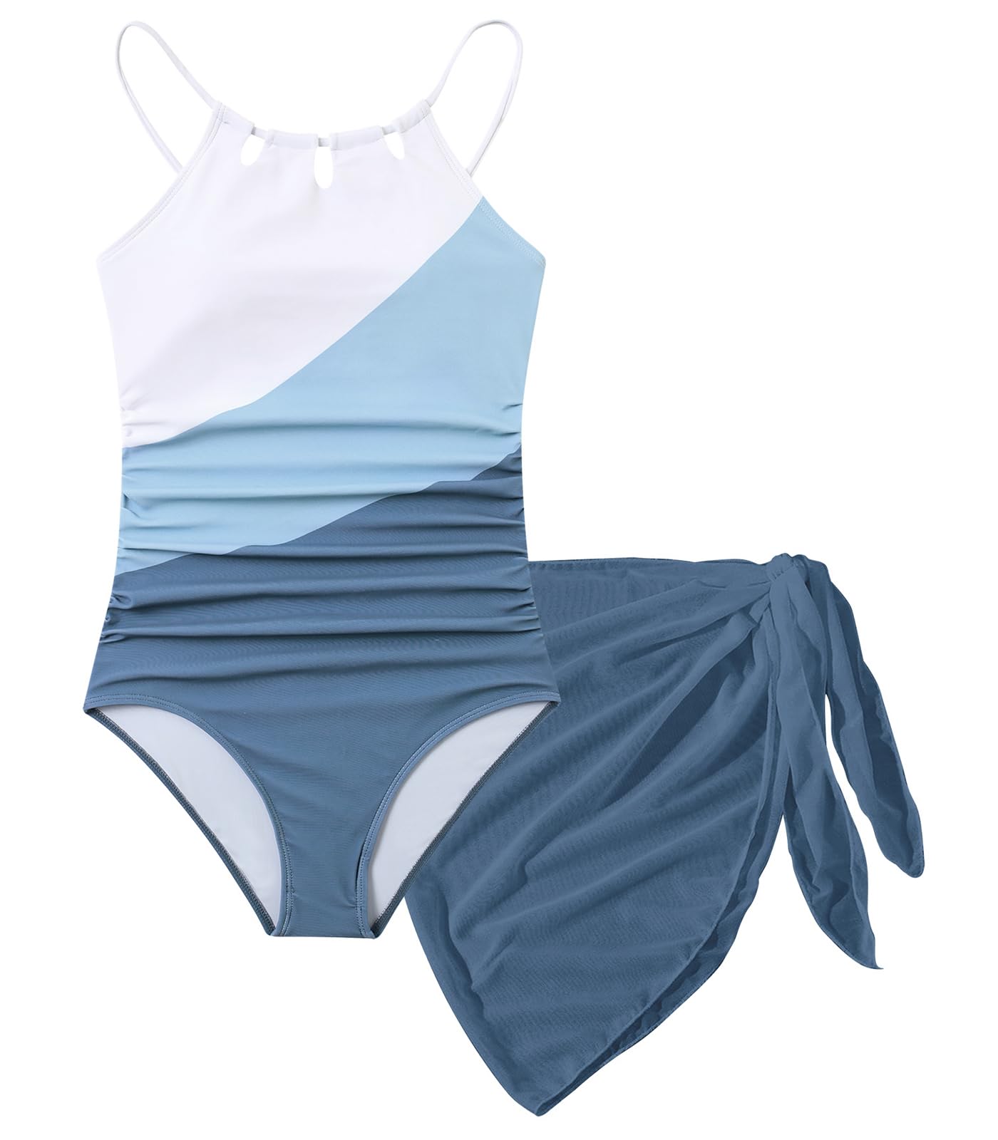 Aideaone Girls Swimsiut One-Piece with Cover Up Adjustable Straps Cut Out Swimwear Beach Bathing Suit Size 8-16
